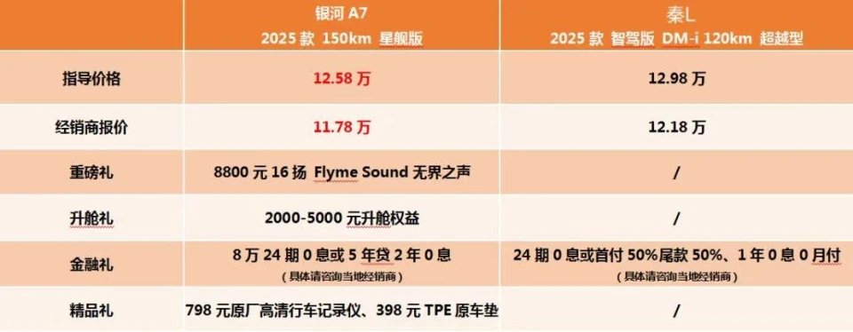 为了公平起见,我们对比的是银河A7 2025款 150km 星舰版和秦L DM-i 2025款 智驾版 DM-i 120km 超越型,银河A7的厂商指导价格为12.58万,经销商报价为11.78万,优惠幅度多达8000元,还有价值8000元的16扬声器、7500元的高速高架NOA、终身基础流量费、3990元充电桩、终身质保等免费服务,性价比确实拉满了。
