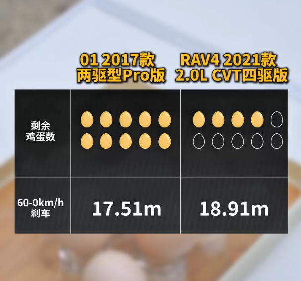 从媒体实测加速性能(扯桌布)视频能看出来,领克01提速更快,在有限的绳子长度内,时速更高,车辆拖拽绳索快速扯掉桌布,桌布上的托盘和上面鸡蛋没有晃动掉下来,而RAV 4荣放在绳子绷直时候,速度没起来,扯掉桌布的同时,也带动了托盘和鸡蛋,导致晃动掉了下来,这就是动力上的区别。