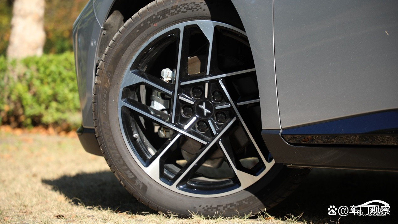 本次实拍车型配备了选配的20英寸熏黑运动轮毂,与标配的18英寸轮毂相比,该轮毂规格为255/45 R20的米其林PS EV轮胎,采用静音设计,兼具了运动感与舒适性。
