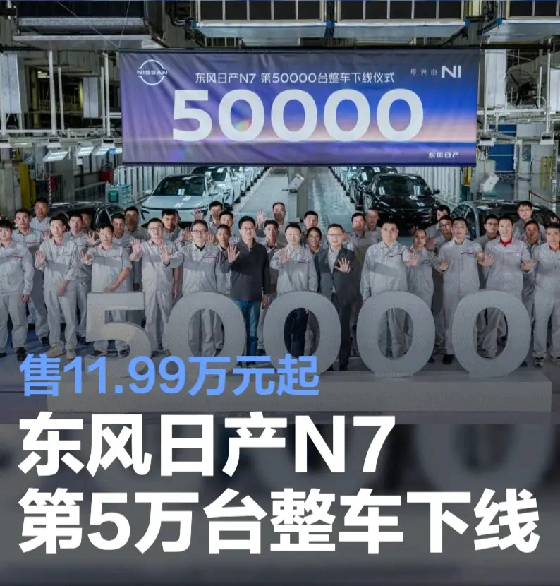 各位老铁,隔壁老王我又来盘车了!今儿咱聊的这台车,名头有点响——东风日产N7。为啥响?人家上市才50天,大定就干出去2万台;这不,第5万台车都已经开下生产线了。作为一台起售价11.99万的合资纯电轿车,这势头,摆明了是要在国产新能源的重重包围中,杀出一条“合资性价比”的血路。