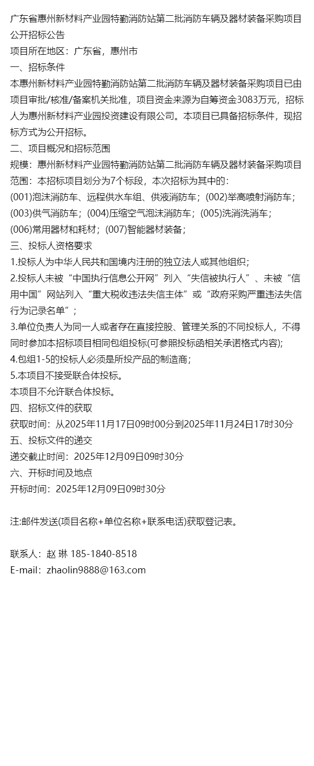 广东省惠州新材料产业园特勤消防站第二批消防车辆及器材装备采购项目公开招标公告广东省惠州新材料产业园特勤消防站第二批消防车辆及器材装备采购项目公开招标公告广东省惠州新材料产业园特勤消防站第二批消防车辆及器材装备采购项目公开招标公告广东省惠州新材料产业园特勤消防站第二批消防车辆及器材装备采购项目公开招标公告广东省惠州新材料产业园特勤消防站第二批消防车辆及器材装备采购项目公开招标公告广东省惠州新材料产业园特勤消防站第二批消防车辆及器材装备采购项目公开招标公告