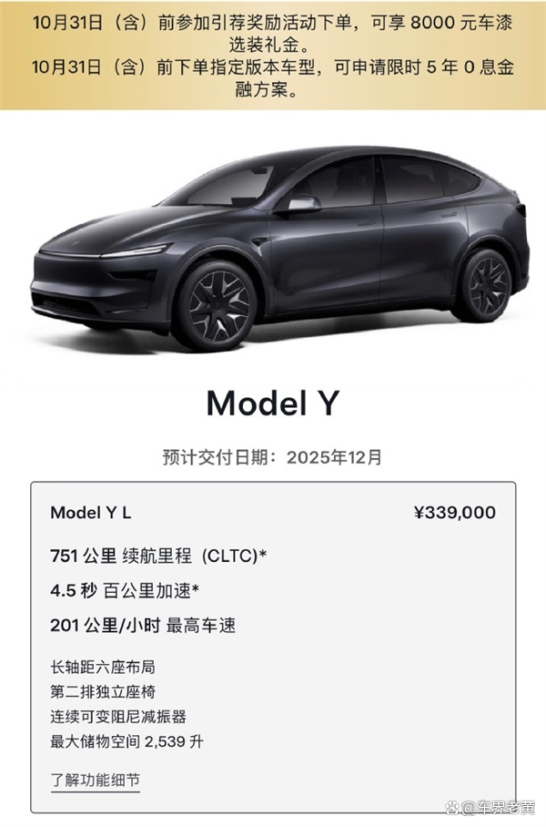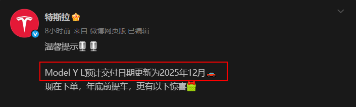 心心念念的特斯拉Model Y L,官方宣布预计交付时间推迟到了2025年12月,比原计划晚了足足三个月。