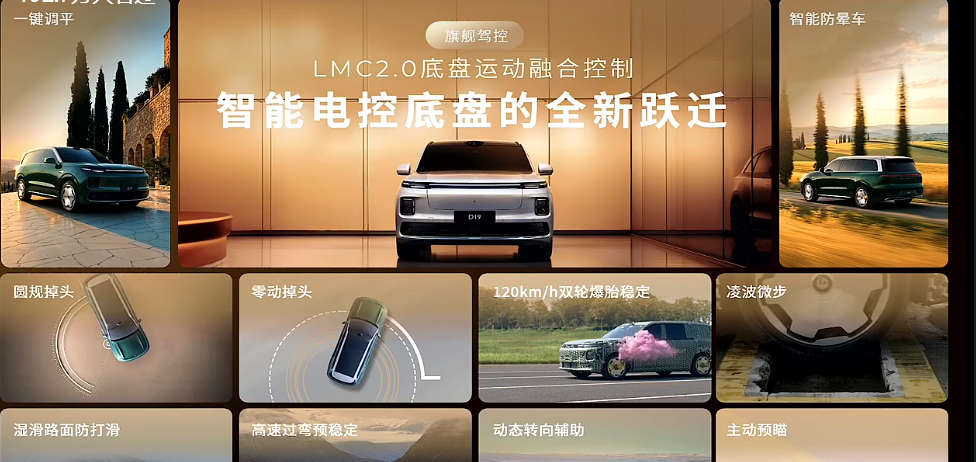 D19搭载双腔闭式空气悬架、CDC减振系统、前双叉臂后五连杆悬架,配合米其林轮胎与MKC2线控制动系统。LMC 2.0底盘控制系统能实现圆规掉头、零动掉头、双轮爆胎稳定、凌波微步等多场景能力,也能根据驾驶状态自动调平和预判姿态,让这台超5米SUV拥有灵活性。