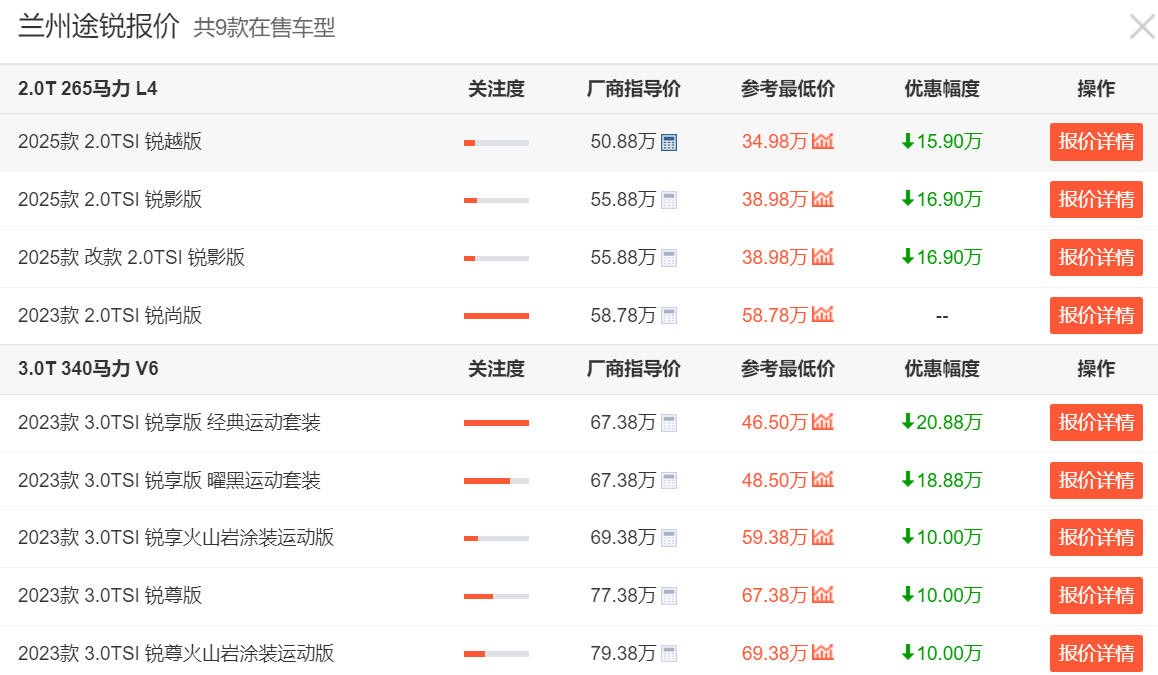 总之,今天之所以会强烈安利途锐这款车,最主要的原因也是因为途锐马上要在2026年正式停产了。对于那些喜欢它的人来说,可能钱还没攒够,车子就已经要停产了,那心里面这得有多大的失落感啊。因此,如果你真的很爱途锐这款车,那么就赶紧趁着现在还能够买到它,去抄底入手一台吧。也希望,今天这则讯息能对你之后的购车有所帮助。(文/优视汽车 大卓 )