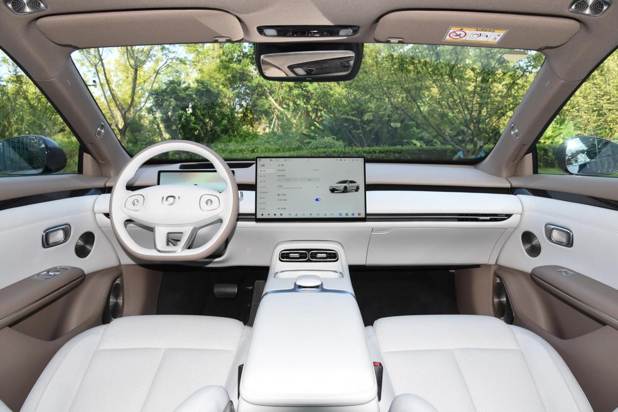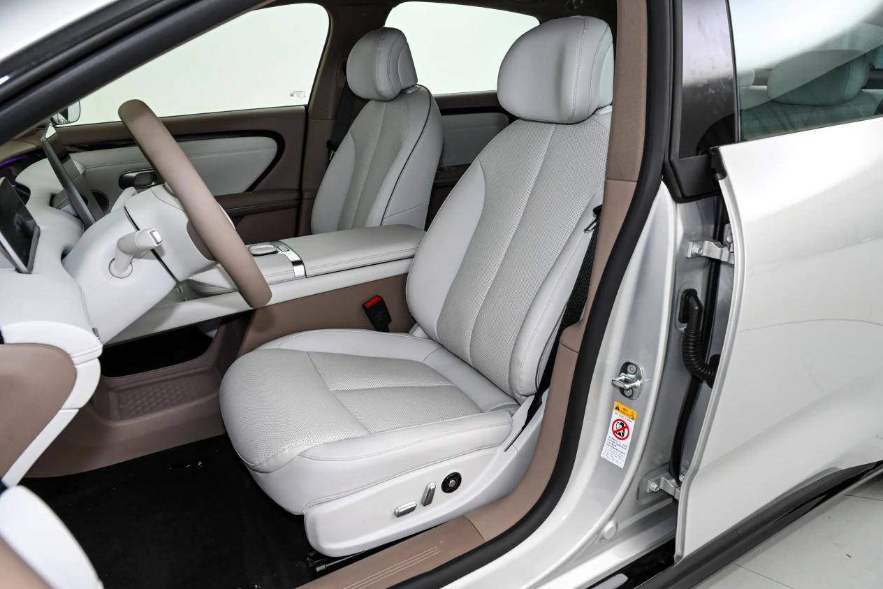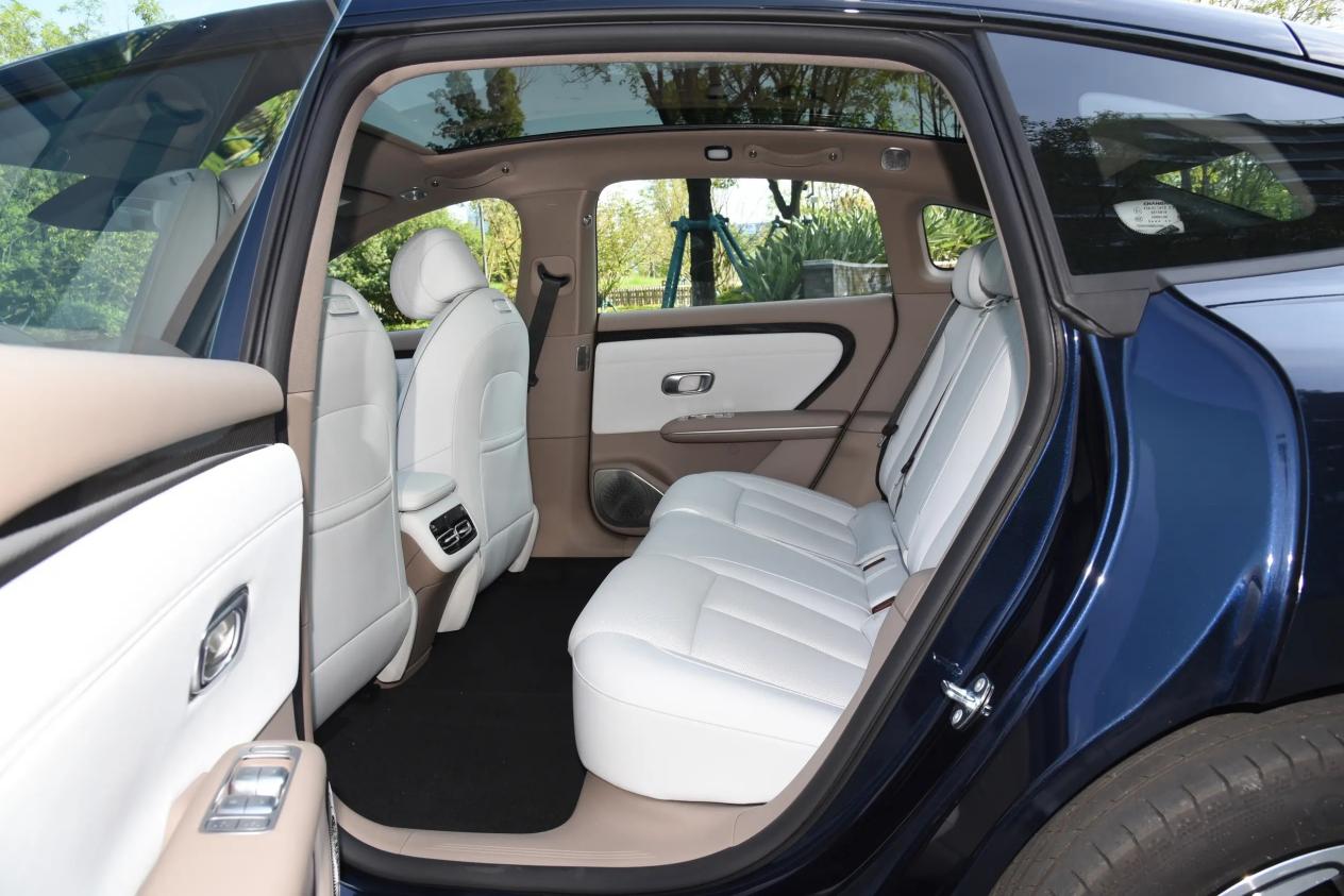 基于纯电平台打造,所以该车的在空间表现上让人印象深刻。车身尺寸为4885×1916×1496毫米,轴距达到2922毫米,拥有高达90%的得房率。坐在车内,最直观的感受是“宽适”。后排头部空间975毫米,膝部空间为160毫米,即便身高1.8米的乘客也能轻松跷起二郎腿。后排走廊宽度500毫米,地板平整,左右位置移动很方便,中间位置的舒适性不差。