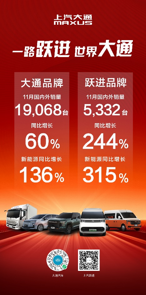财圈社消息,2025年12月1日,上汽大通公布最新销量数据:上汽大通11月批售24,400辆,同比大增81%,并实现零售月销同比“十连增”。持续巩固在全球轻型商用车市场的领导地位,11月海外销量达10,095辆,同比大增92%,订单、批售、零售、发运量均实现“破万”,再创历史新高。新能源车型销量同比剧增196%,其中国内新能源车型销量占比达53%,转型步伐全面提速:新能源轻客“爆品”大通大拿热销3,207辆,同比劲增214%!跃进新能源车型销量同比增长315%、销量占比高达72%。实力引领,频获大单,大拿V1、大家9、大家7等多款新能源标杆产品成客货运行业信赖之选。