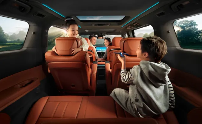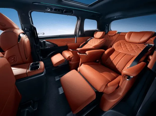 进入车内,向往M8宗师提供了“马会庄园”红棕与“烟波浩渺”浅灰两种内饰风格,大面积软质材料包覆营造出豪华氛围。双辐式多功能方向盘、12.3英寸全液晶仪表和14.6英寸(或15.6英寸)中控多媒体屏构成了驾驶区的信息交互核心。新车采用2+2+3的7座布局,第二排航空座椅功能丰富,高配车型更升级为双零重力座椅,支持18向调节、16点式按摩,靠背最大可调至166°,配合一键SPA功能,将乘坐舒适性推向新高度。激光雷达版还配备了可折叠收纳小桌板和5英寸扶手屏,兼顾了商务与家庭出行场景。