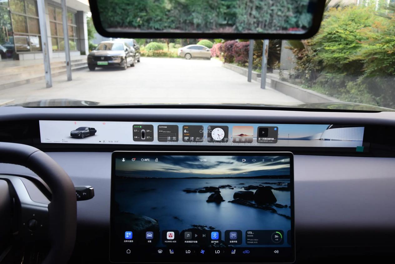 液晶仪表是一块靠近前挡风玻璃的35.4英寸带鱼屏,比较窄,但尺寸更长,显示的内容很丰富,续航、电量、驾驶信息等都能呈现,基本上能代替HUD抬头显示的功能,不用刻意低头就能读取,还是比较方便的。中控中央是一块15.6英寸的悬浮屏,内置鸿蒙座舱5系统,车机的响应速度很快,几乎感受不到延迟,各种应用切换顺滑,声纹识别能准确区分不同乘客的指令,支持可见即可说,比较聪明,模糊语义能理解。车机系统跟手机之间的互联非常方便,导航之类的都可以无缝流转,免去了每次单独手动操作的麻烦。