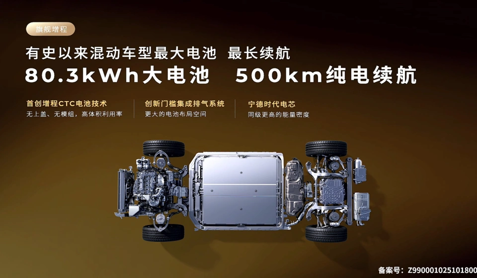 最让我感兴趣的是它的动力系统。增程版居然能做到纯电续航500公里,综合续航超过2000公里,这数据确实惊艳。三电机四驱版本的系统功率达到400千瓦,零百加速只要4秒级,对于这么大一台车来说,性能相当强悍了。纯电版的性能更是夸张,540千瓦的系统功率,零百加速直接进入3秒俱乐部,续航也能达到720公里。