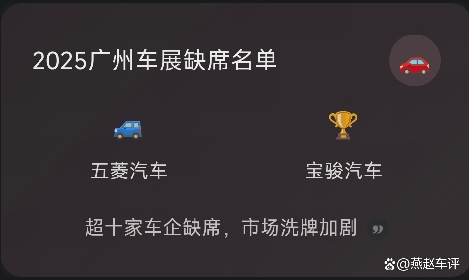 2025 年广州国际车展的喧嚣中,五菱汽车与宝骏的双双缺席,成为最刺眼的沉默。这绝非 “无新车可发”