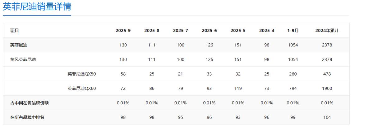 英菲尼迪就更惨了,在今年上半年1月~9月仅仅卖出了1054辆,主力车型QX50在6月的时候更是只卖出了33辆。