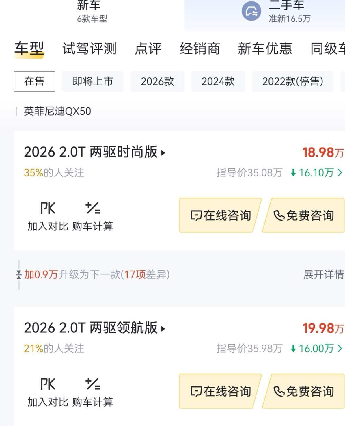 另外,为了缓解销售压力,英菲尼迪也采取了降价的策略,比如在2017年的时候,QX50的价格接近30万,如今20万不到就能买到一辆。