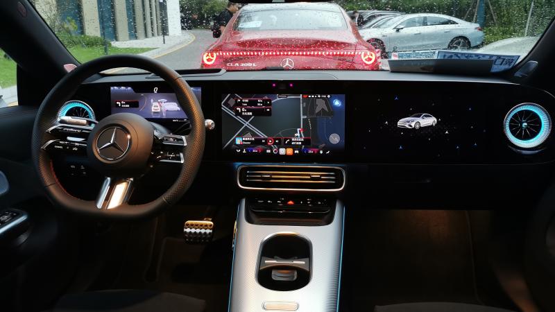 进入车内,你很容易被横亘在中控台上的三块MBUX大屏吸引,却不会注意到这三块屏是以6度倾角后仰的方式面对用户,这不仅符合理想的人体工程学角度,还能最大程度抑制日间屏幕自身的反光和夜间屏幕在车窗上的反光。