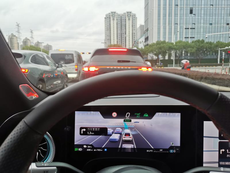 仪表盘上的驾驶辅助页面上,会显示详实的系统工作状态。除了系统工作模式、车辆行驶状态等常规信息之外,前方道路走向、导航路径以及周围车辆的动态也会体现在屏幕上,几十部感知元件形成的对车辆周边环境的认知重新浮现在10.25英寸的仪表盘和HUD抬头显示器上,方便驾驶者将这些信息与自身感知相互印证,保持完整的情景意识,以便在必要时顺畅接管车辆。