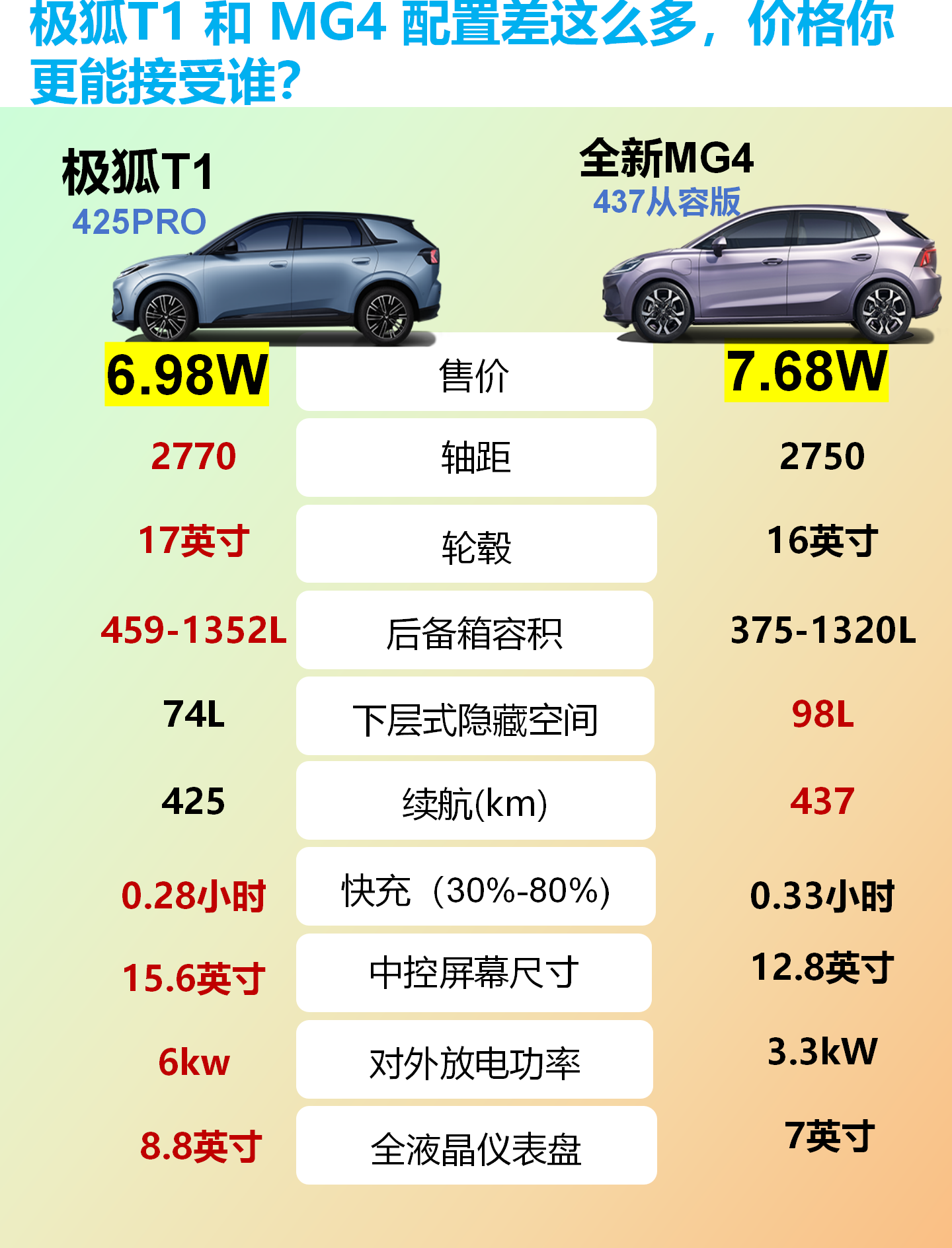 对于预算有限但又追求品质的年轻人来说,10万元左右的纯电小车无疑是理想之选。然而,在这个价位区间,MG4与极狐T1之间的竞争堪称白热化。MG4作为老牌劲旅,拥有成熟的技术和广泛的用户基础;而极狐T1则以大胆的设计语言和丰富的智能化配置成功突围。两者各有千秋,如何取舍成了许多购车者面临的难题。接下来,我们将围绕外观、空间、舒适性以及安全配置等方面展开全面解析,助你拨开迷雾,做出明智决策。