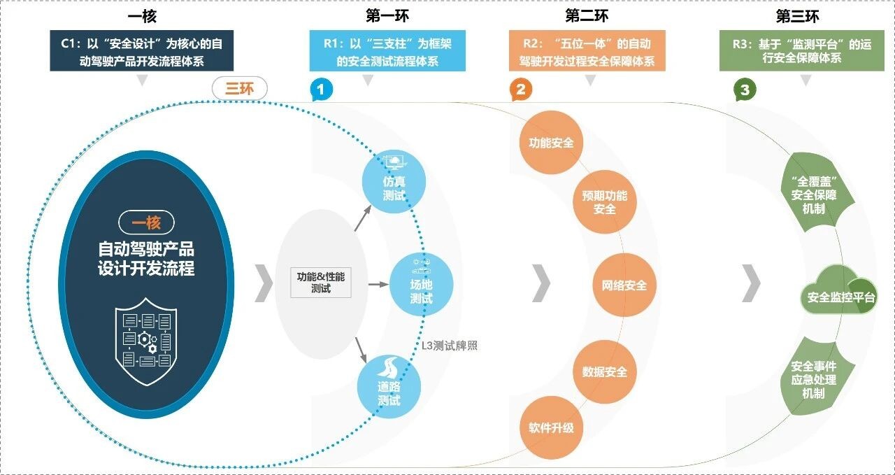 极狐阿尔法S(L3版)能获批上路试点,背后离不开其强大的技术支撑----元境智能网联技术体系。这一体系是极狐多年技术沉淀与开放合作的结晶,它构建起"一核三环"智能网联汽车安全开发保障体系。"一核"是以"体系保障安全"为核心理念,建立以安全设计与验证为导向的开发流程体系;"三环"则是测试验证保障、过程安全保障、运行监测保障,三重防护覆盖产品全生命周期。