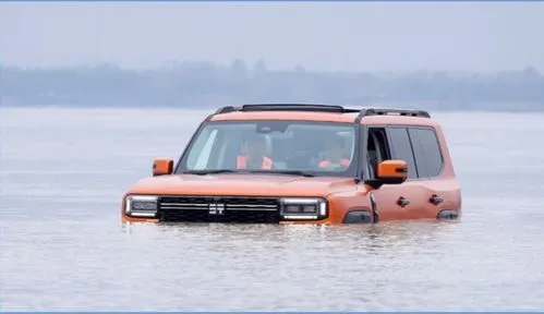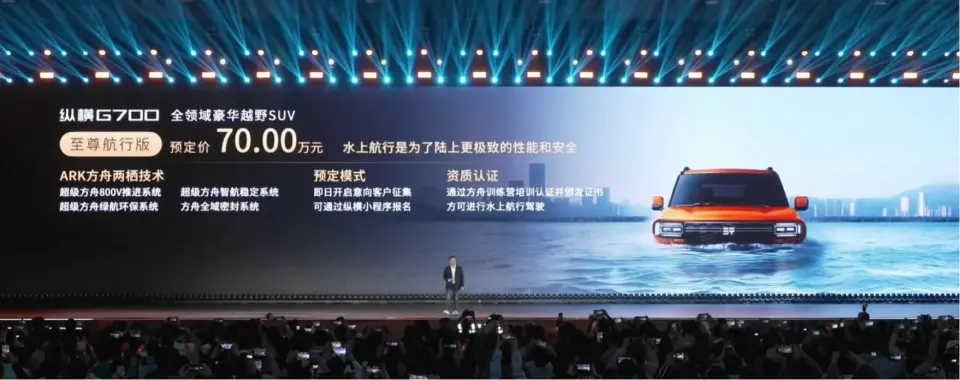 越野底子是衡量硬派SUV的关键指标。纵横G700采用非承载式车身结构,全系标配三把锁,高配车型更配备了CDC减震与空气悬架组合的“云台底盘”,这使得其最大离地间隙达到320毫米,具备970毫米的涉水深度。而它最引人注目的,无疑是那项“横渡长江”的两栖能力。通过车尾两个15kW高压碳化硅推进器与IP68级防水车身的结合,G700能够以7公里/小时的航速在水面航行,这种主动式的水域通过能力,与方程豹豹8以及仰望U8的应急浮水模式有着本质区别,为其赢得了独特的市场定位。