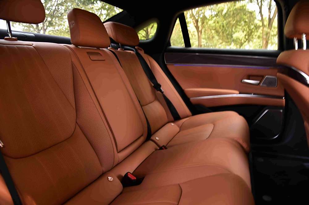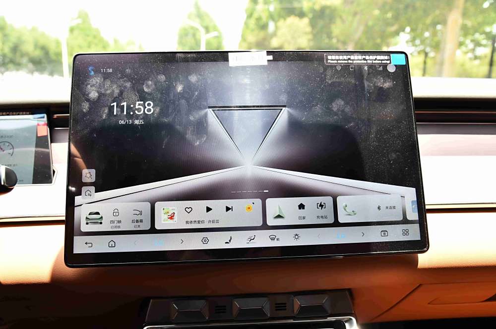 主动闭合式进气格栅能保护车里的硬件,自适应远近光和转向辅助灯在黑的地方开车也能看得清清楚楚,晚上开车更安全了。汉L的内饰里,中控屏幕特别大,有15.6英寸呢,坐在后排也能看得清,就像在家看电视一样爽!