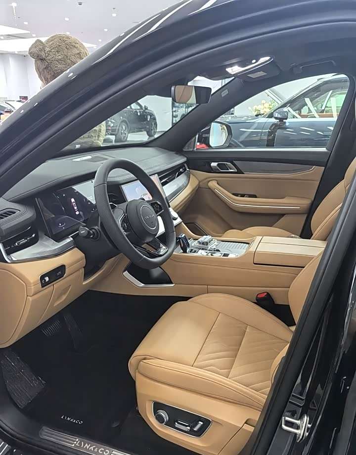 今天店里的是辆白色燃油版试驾车,颜值真高👍。黑白搭配,永远的经典,我最喜欢这车的轮毂,简洁大方。领克的车灯也很有辨识度,引擎盖旁的灯是领克独有的。车超过5米长,轴距2984mm。内饰用料很讲究,一进去就感觉很豪华,座椅、中控台、门板都是真皮包裹的,还有铝制饰板和部分翻毛皮材质,触感很细腻,整体做工用料都很用心👏。