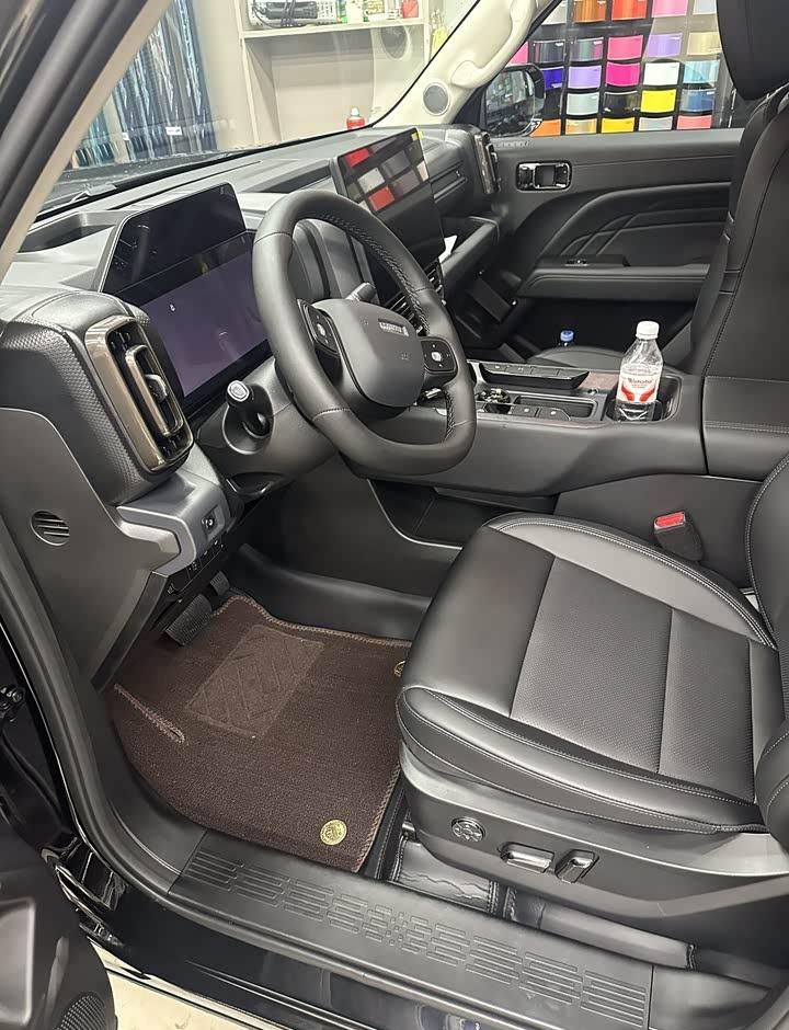 外观是我选它的重要原因🤩,方方正正的车身特别有力量感,前脸的格栅也好看,还有点像大狗呢,圆形大灯搭配着看着特别精神,不像有些SUV看着软趴趴的。车身侧面的线条很规整,轮毂的样式也挺运动的,整体看着既复古又时尚。内饰我选了双拼黑棕色,做工和用料在这个价位里算不错的了。中控台用了不少软质材料,摸着手感好,不会有廉价的塑料感。中控大屏幕设计看着很规整,屏幕反应速度也还行,操作起来不卡顿。空调出风口的造型很有个性,档把的手感也不错,整体内饰风格简约又不失科技感,看着特别舒服。