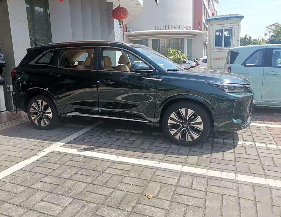 这车外观我一眼就相中了,大气!前脸设计喜欢,封闭式中间,进气格栅在底部,尾部贯穿式大灯很酷,线条流畅,力量感强。极光绿色有质感,越看越喜欢。内饰也惊喜,软质包裹多,虽然不是真皮,但手感不错。中控台简洁,大屏15.6英寸,功能多,清晰度高。方向盘快捷按钮方便,音响效果再提升点就更好了。
