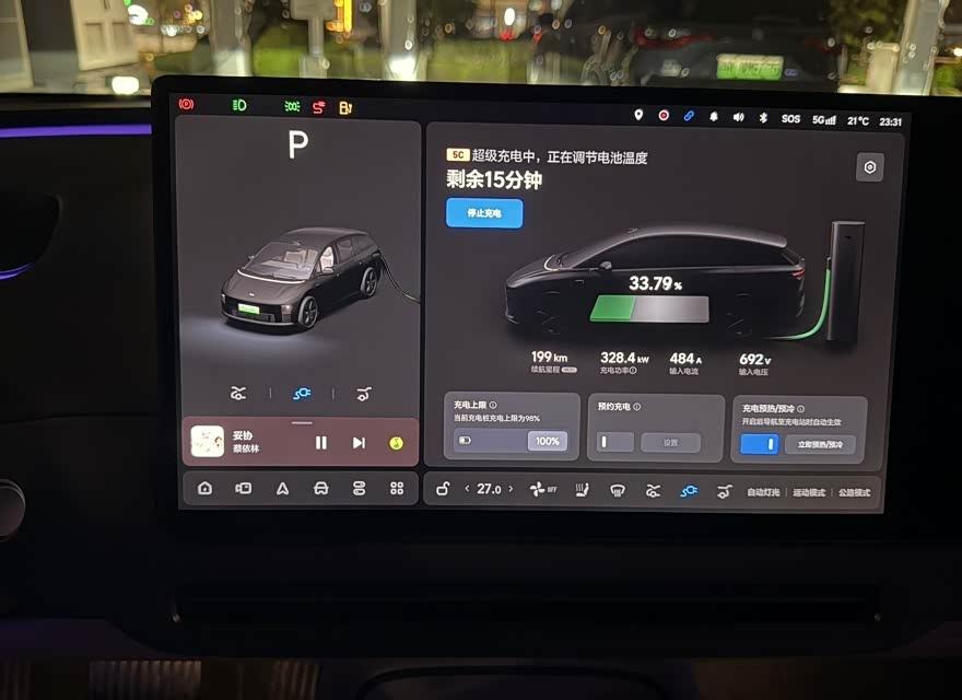 CLTC续航有720km,市区实际能跑550km左右,一周充一次电就足够了。高速表现也挺不错的,前两天去了新乡胖东来,高速实际跑了420公里还剩一点电。5C超快充是真的给力,充电10分钟就能补500km,15分钟就能从10%充到80%,喝杯奶茶的功夫又可以继续出发了。